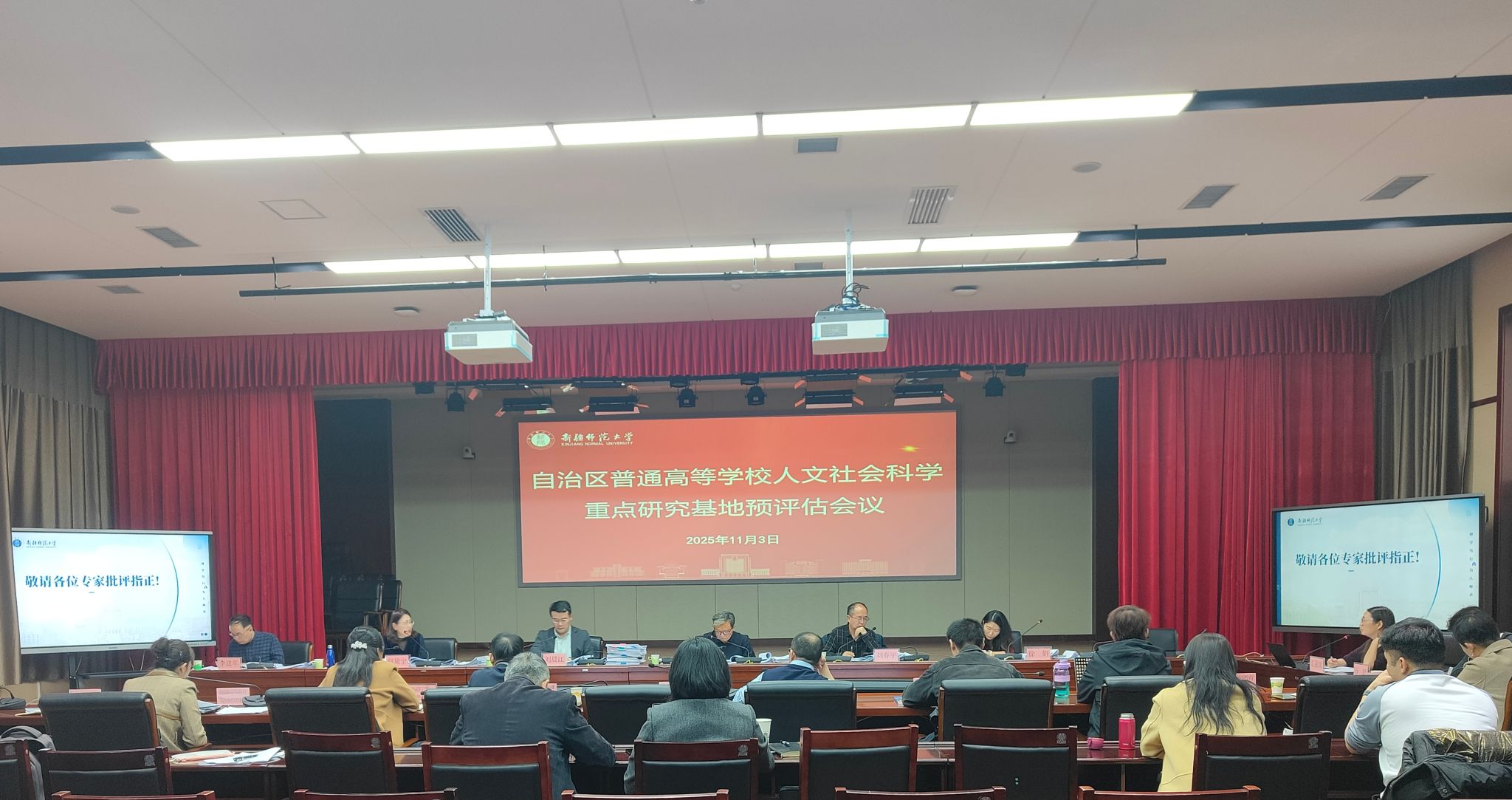 11月3日,我校自治区普通高等学校人文社会科学重点研究基地预评估会议在温泉校区行政楼第五会议室举行。原自治区教育厅一级巡视员、国务院政府特殊津贴专家、二级教授艾光辉,自治区党委宣传部社科工作办副主任(主持工作)、一级调研员赵黛宁,新疆农业大学乡村振兴研究院院长、研究员刘春宇,我校期刊社社长、教授李建军四位评审专家参加评审。校党委常委、副校长刘晨江出席会议。学校11个自治区文科基地负责人、秘书、依托学院领导和社会科学处工作人员参加会议。会议由学校社会科学处副处长徐妍主持。