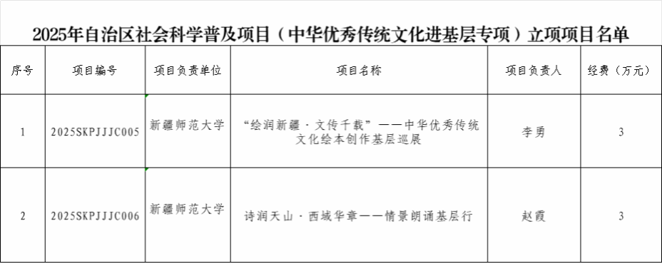 近日,自治区社会科学界联合会公布了2025年自治区社会科学普及项目(中华优秀传统文化进基层专项)立项名单,我校获批立项2项。
