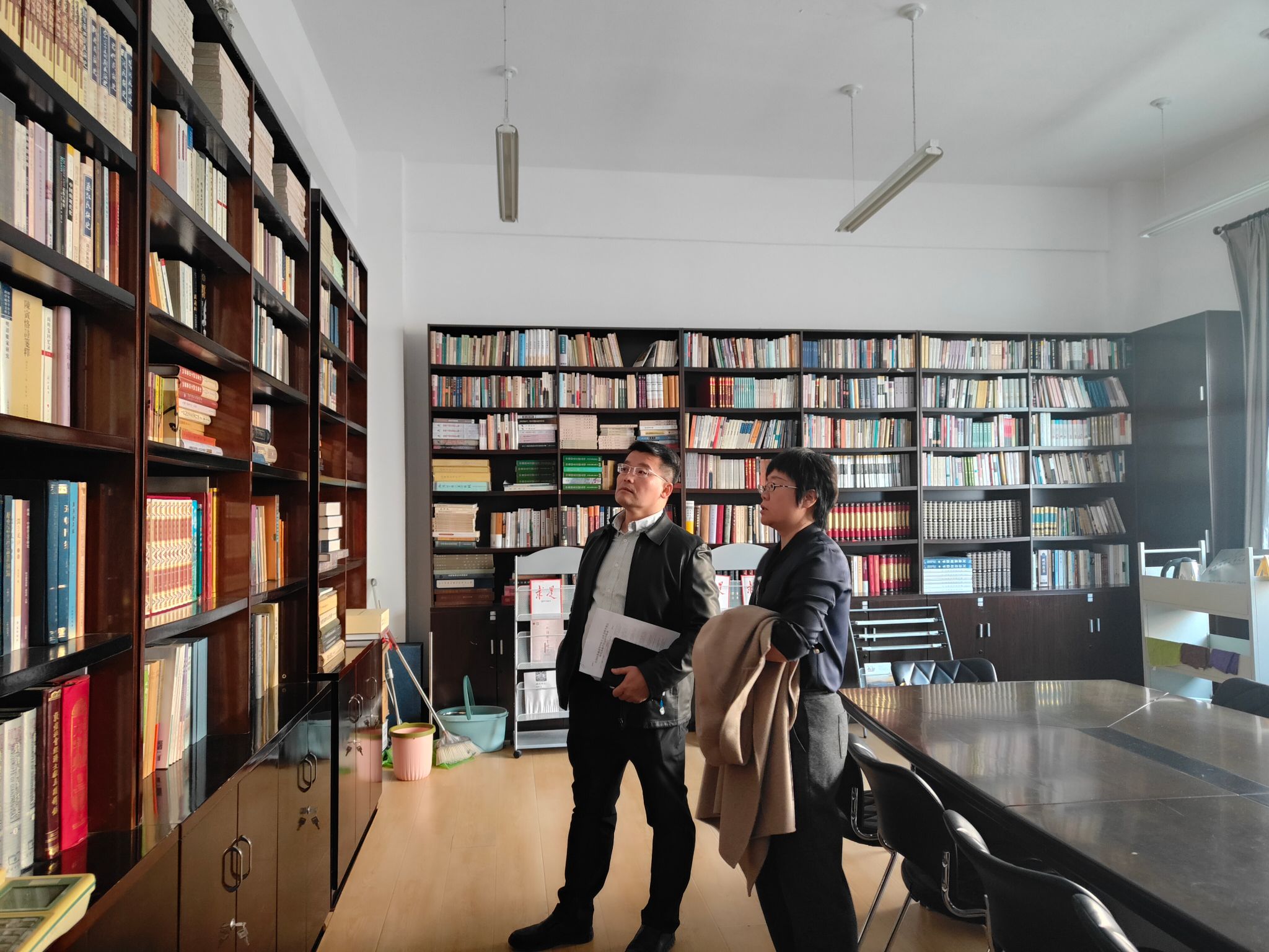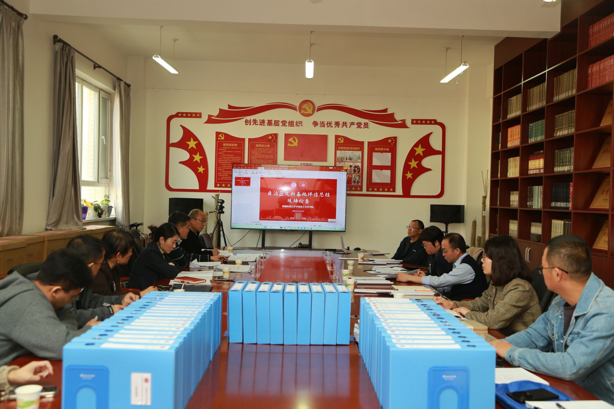 检查中,刘晨江带领基地负责人、秘书现场查看了西域文史研究中心资料室及办公场所,查阅了汇报基地评估材料及成果展示材料,各文科基地进行了现场交流学习。各基地及依托学院一致表示,将进一步统筹谋划、打磨材料,扎实推进,高质量迎接自治区评估验收。